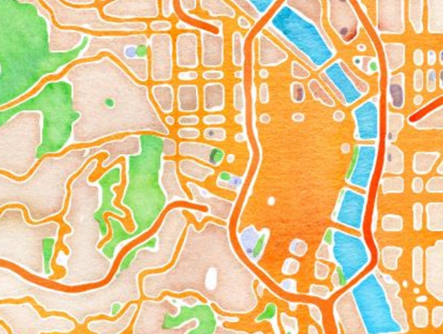 What would it look like if modern mapping technology still relied on a handrawn look? Stamen Design overlaid watercolor textures on OpenStreetMap map tiles and the effect does indeed add “warm pop” to the maps. The Watercolor mapping project was inspired by the Bicycle Portraits project.