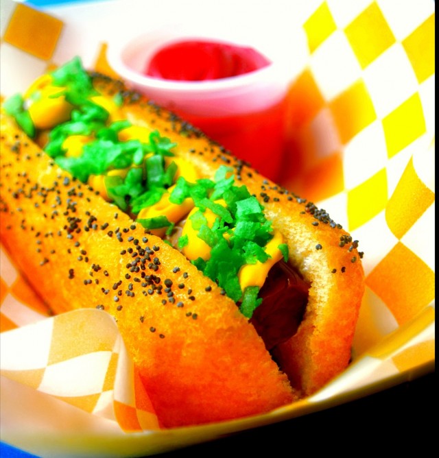 Boy do they sound tasty: “They start with housemade foie gras sausages made with a mixture of chicken breast, foie gras, and pork fat back, added to a lamb casing. Critchley takes the sausages and dunks them in his corn dog batter (made with white cornmeal, flour, baking powder, soda and buttermilk) and deep-fries them, serving the finished dogs with a cornichon relish, housemade cognac mustard, and espelette pepper.”