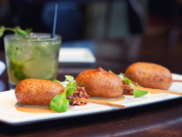 Boy do they sound tasty: “They start with housemade foie gras sausages made with a mixture of chicken breast, foie gras, and pork fat back, added to a lamb casing. Critchley takes the sausages and dunks them in his corn dog batter (made with white cornmeal, flour, baking powder, soda and buttermilk) and deep-fries them, serving the finished dogs with a cornichon relish, housemade cognac mustard, and espelette pepper.”