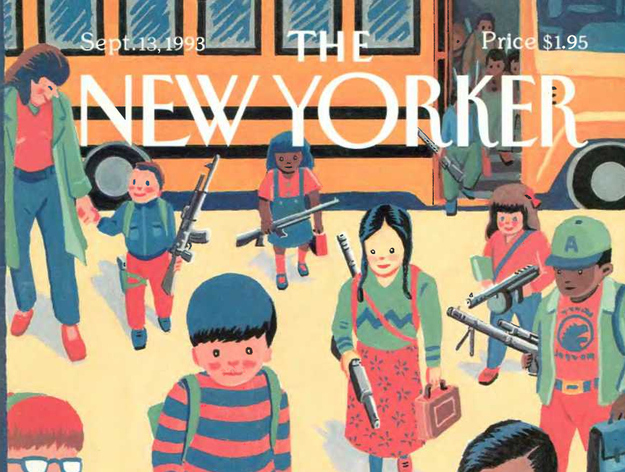 author and illustrator, drew a cover for The New Yorker of a bunch of school kids getting off the bus armed to the teeth with guns. It doesn’t seem so far removed from the rhetoric being spewed by the gun lobby in the wake of the Newtown massacre.